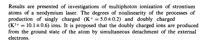 Results are presented of investigations of multiphoton ionization of strontium atoms of a neodymium laser. The degrees of nonlinearity of the processes of production of singly charged (K+ = 5.0±0.2) and doubly charged (K2+ = 10.1 ±0.6) ions. It is proposed that the doubly charged ions are produced from the ground state of the atom by simultaneous detachment of the external electrons.