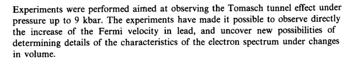 Experiments were performed aimed at observing the Tomasch tunnel effect under pressure up to 9 kbar. The experiments have made it possible to observe directly the increase of the Fermi velocity in lead, and uncover new possibilities of determining details of the characteristics of the electron spectrum under changes in volume.