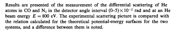 Results are presented of the measurement of the differential scattering of He atoms in CO and N2 in the detector angle interval (0-5) X 10~2 rad and at an He beam energy Ε = 800 eV. The experimental scattering picture is compared with the relation calculated for the theoretical potential-energy surfaces for the two systems, and a difference between them is noted.