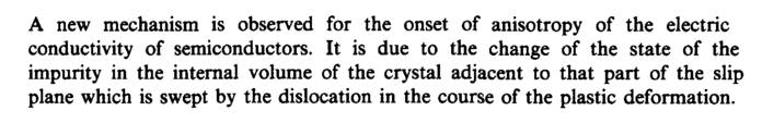 A new mechanism is observed for the onset of anisotropy of the electric conductivity of semiconductors. It is due to the change of the state of the impurity in the internal volume of the crystal adjacent to that part of the slip plane which is swept by the dislocation in the course of the plastic deformation.