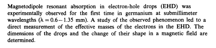 Magnetodipole resonant absorption in electron-hole drops (EHD) was experimentally observed for the first time in germanium at submillimeter wavelengths (λ = 0.6—1.35 mm). A study of the observed phenomenon led to a direct measurement of the effective masses of the electrons in the EHD. The dimensions of the drops and the change of their shape in a magnetic field are determined.