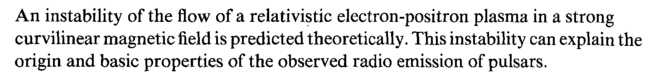An instability of the flow of a relativistic electron-positron plasma in a strong curvilinear magnetic field is predicted theoretically. This instability can explain the origin and basic properties of the observed radio emission of pulsars.