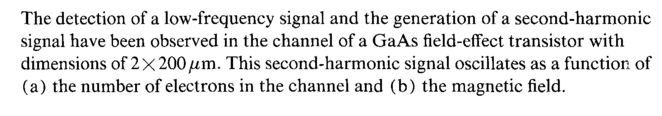 The detection of a low-frequency signal and the generation of a second-harmonic signal have been observed in the channel of a GaAs field-effect transistor with dimensions of 2 X 200μπι. This second-harmonic signal oscillates as a function of (a) the number of electrons in the channel and (b) the magnetic field.
