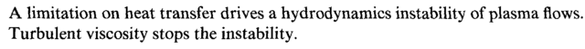 A limitation on heat transfer drives a hydrodynamics instability of plasma flows. Turbulent viscosity stops the instability.