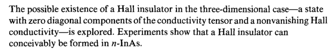 The possible existence of a Hall insulator in the three-dimensional case—a state with zero diagonal components of the conductivity tensor and a nonvanishing Hall conductivity—is explored. Experiments show that a Hall insulator can conceivably be formed in rc~InAs.