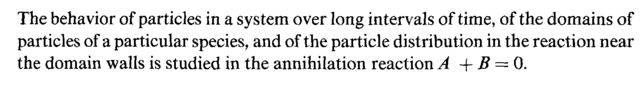 The behavior of particles in a system over long intervals of time, of the domains of particles of a particular species, and of the particle distribution in the reaction near the domain walls is studied in the annihilation reaction A + В = 0.