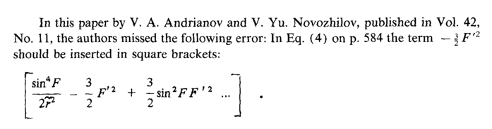 In this paper by V. A. Andrianov and V. Yu. Novozhilov, published in Vol. 42, No. 11, the authors missed the following error: In Eq. (4) on p. 584 the term — \ F'2 should be inserted in square brackets: 2? 2 2
