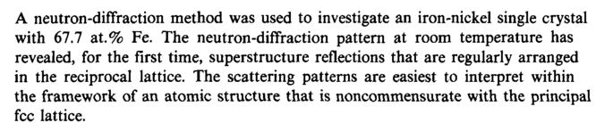 A neutron-diffraction method was used to investigate an iron-nickel single crystal with 67.7 at.% Fe. The neutron-diffraction pattern at room temperature has revealed, for the first time, superstructure reflections that are regularly arranged in the reciprocal lattice. The scattering patterns are easiest to interpret within the framework of an atomic structure that is noncommensurate with the principal fee lattice.
