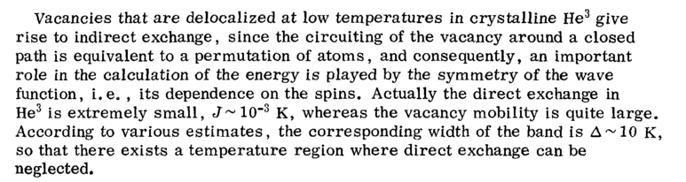 Vacancies that are delocalized at low temperatures in crystalline He3 give rise to indirect exchange, since the circuiting of the vacancy around a closed path is equivalent to a permutation of atoms, and consequently, an important role in the calculation of the energy is played by the symmetry of the wave function, i.e. , its dependence on the spins. Actually the direct exchange in He3 is extremely small, J~10"3 K, whereas the vacancy mobility is quite large. According to various estimates, the corresponding width of the band is Δ~10 K, so that there exists a temperature region where direct exchange can be neglected.