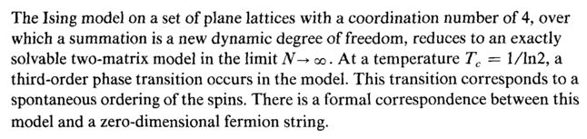 The Ising model on a set of plane lattices with a coordination number of 4, over which a summation is a new dynamic degree of freedom, reduces to an exactly solvable two-matrix model in the limit N^> oo. At a temperature Tc = l/ln2, a third-order phase transition occurs in the model. This transition corresponds to a spontaneous ordering of the spins. There is a formal correspondence between this model and a zero-dimensional fermion string.