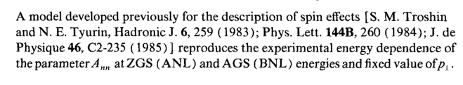 A model developed previously for the description of spin effects [S. M. Troshin and N. E. Tyurin, Hadronic J. 6, 259 (1983); Phys. Lett. 144B, 260 (1984); J. de Physique 46, C2-235 (1985) ] reproduces the experimental energy dependence of the parameter^ atZGS (ANL) and AGS (BNL) energies and fixed value ofpL.