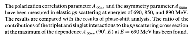 The polarization correlation parameter/4 ωηη and the asymmetry parameter ,4 000rt have been measured in elastic pp scattering at energies of 690, 850, and 890 MeV. The results are compared with the results of phase-shift analysis. The ratio of the contributions of the triplet and singlet interactions to the pp scattering cross section at the maximum of the dependence^ Шлзл (90°, Ε) at Ε — 690 MeV has been found.