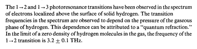 The 1 -> 2 and 1 3 photoresonance transitions have been observed in the spectrum of electrons localized above the surface of solid hydrogen. The transition frequencies in the spectrum are observed to depend on the pressure of the gaseous phase of hydrogen. This dependence can be attributed to a "quantum refraction." In the limit of a zero density of hydrogen molecules in the gas, the frequency of the 1 2 transition is 3.2 ± 0.1 THz.