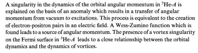 A singularity in the dynamics of the orbital angular momentum in 3Hq-A is explained on the basis of an anomaly which results in a transfer of angular momentum from vacuum to excitations. This process is equivalent to the creation of electron-positron pairs in an electric field. A Wess-Zumino function which is found leads to a source of angular momentum. The presence of a vortex singularity on the Fermi surface in 3He-A leads to a close relationship between the orbital dynamics and the dynamics of vortices.