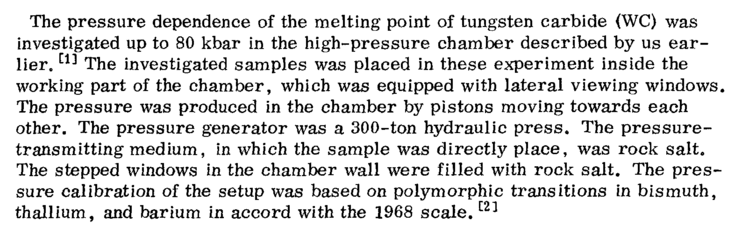 The pressure dependence of the melting point of tungsten carbide (WC) was investigated up to 80 kbar in the high-pressure chamber described by us earlier. C1] The investigated samples was placed in these experiment inside the working part of the chamber, which was equipped with lateral viewing windows. The pressure was produced in the chamber by pistons moving towards each other. The pressure generator was a 300-ton hydraulic press. The pressure-transmitting medium, in which the sample was directly place, was rock salt. The stepped windows in the chamber wall were filled with rock salt. The pressure calibration of the setup was based on polymorphic transitions in bismuth, thallium, and barium in accord with the 1968 scale.C2]