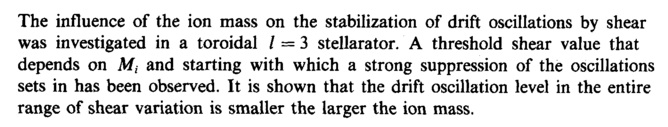The influence of the ion mass on the stabilization of drift oscillations by shear was investigated in a toroidal / = 3 stellarator. A threshold shear value that depends on Mt and starting with which a strong suppression of the oscillations sets in has been observed. It is shown that the drift oscillation level in the entire range of shear variation is smaller the larger the ion mass.