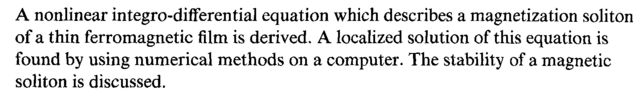 A nonlinear integro-differential equation which describes a magnetization soliton of a thin ferromagnetic film is derived. A localized solution of this equation is found by using numerical methods on a computer. The stability of a magnetic soliton is discussed.