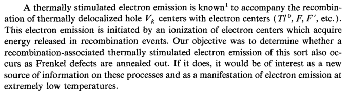 A thermally stimulated electron emission is known1 to accompany the recombination of thermally deiocalized hole Vk centers with electron centers (77°, F, F'9 etc.). This electron emission is initiated by an ionization of electron centers which acquire energy released in recombination events. Our objective was to determine whether a recombination-associated thermally stimulated electron emission of this sort also occurs as Frenkel defects are annealed out. If it does, it would be of interest as a new source of information on these processes and as a manifestation of electron emission at extremely low temperatures.