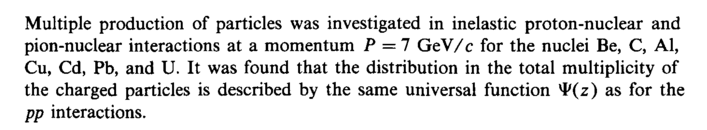 Multiple production of particles was investigated in inelastic proton-nuclear and pion-nuclear interactions at a momentum Ρ =1 GeV/c for the nuclei Be, C, Al, Cu, Cd, Pb, and U. It was found that the distribution in the total multiplicity of the charged particles is described by the same universal function Ψ(ζ) as for the pp interactions.