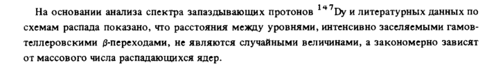 14 7 На основании анализа спектра запаздывающих протонов Dy и литературных данных по схемам распада показано, что расстояния между уровнями, интенсивно заселяемыми гамов-теллеровскими ^-переходами, не являются случайными величинами, а закономерно зависят от массового числа распадающихся ядер.