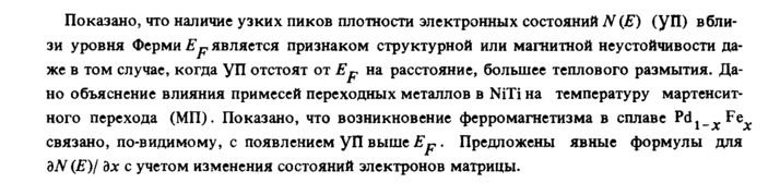 Показано, что наличие узких пиков плотности электронных состояний Ν(Е) (уП) вблизи уровня Ферми Ер является признаком структурной или магнитной неустойчивости даже в том случае, когда УП отстоят от Ер на расстояние, большее теплового размытия. Дано объяснение влияния примесей переходных металлов в NiTi на температуру мартенсит-ного перехода (МП). Показано, что возникновение ферромагнетизма в сплаве Fe связано, по-видимому, с появлением уП выше Ер. Предложены явные формулы для bN(E)l Ъх с учетом изменения состояний электронов матрицы.