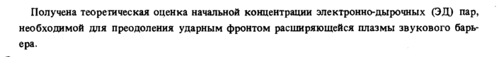 Получена теоретическая оценка начальной концентрации электронно-дырочных (ЭД) пар, необходимой для преодоления ударным фронтом расширяющейся плазмы звукового барьера.