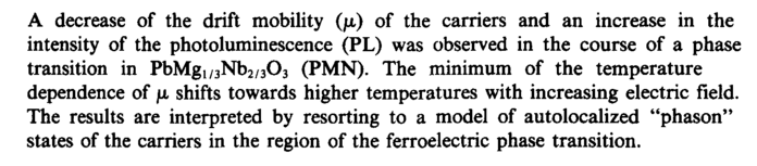 A decrease of the drift mobility (μ) of the carriers and an increase in the intensity of the photoluminescence (PL) was observed in the course of a phase transition in PbMg1/3Nb2/303 (PMN). The minimum of the temperature dependence of μ shifts towards higher temperatures with increasing electric field. The results are interpreted by resorting to a model of autolocalized "phason" states of the carriers in the region of the ferroelectric phase transition.