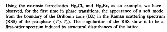 Using the extrinsic ferroelastics Hg2Cl2 and Hg2Br2 as an example, we have observed, for the first time in phase transitions, the appearance of a soft mode from the boundary of the Brillouin zone (BZ) in the Raman scattering spectrum (RSS) of the paraphase (T> Tc). The singularities of the RSS show it to be a first-order spectrum induced by structural disturbances of the lattice.