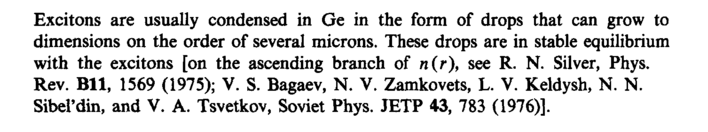 Excitons are usually condensed in Ge in the form of drops that can grow to dimensions on the order of several microns. These drops are in stable equilibrium with the excitons [on the ascending branch of n(r), see R. N. Silver, Phys. Rev. Bll, 1569 (1975); V. S. Bagaev, Ν. V. Zamkovets, L. V. Keldysh, N. N. Sibel'din, and V. A. Tsvetkov, Soviet Phys. JETP 43, 783 (1976)].