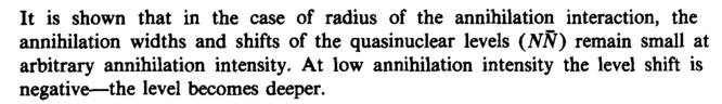 It is shown that in the case of radius of the annihilation interaction, the annihilation widths and shifts of the quasinuclear levels (NN) remain small at arbitrary annihilation intensity. At low annihilation intensity the level shift is negative—the level becomes deeper.