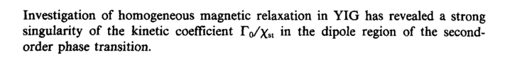 Investigation of homogeneous magnetic relaxation in YIG has revealed a strong singularity of the kinetic coefficient Γο/χ81 in the dipole region of the second-order phase transition.