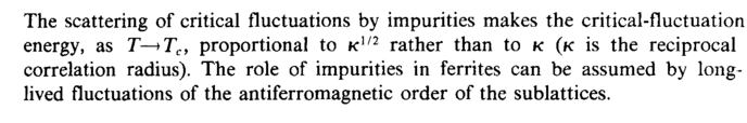 The scattering of critical fluctuations by impurities makes the critical-fluctuation energy, as Г—>TC, proportional to к1/2 rather than to к (к is the reciprocal correlation radius). The role of impurities in ferrites can be assumed by long-lived fluctuations of the antiferromagnetic order of the sublattices.