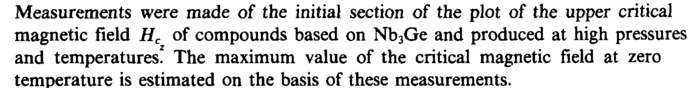Measurements were made of the initial section of the plot of the upper critical magnetic field Hc of compounds based on Nb3Ge and produced at high pressures and temperatures. The maximum value of the critical magnetic field at zero temperature is estimated on the basis of these measurements.