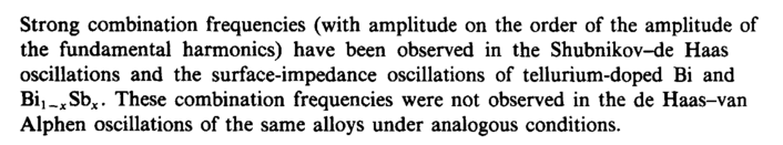 Strong combination frequencies (with amplitude on the order of the amplitude of the fundamental harmonics) have been observed in the Shubnikov-de Haas oscillations and the surface-impedance oscillations of tellurium-doped Bi and Bi^Sb^. These combination frequencies were not observed in the de Haas-van Alphen oscillations of the same alloys under analogous conditions.