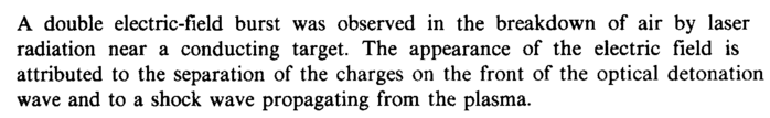 A double electric-field burst was observed in the breakdown of air by laser radiation near a conducting target. The appearance of the electric field is attributed to the separation of the charges on the front of the optical detonation wave and to a shock wave propagating from the plasma.