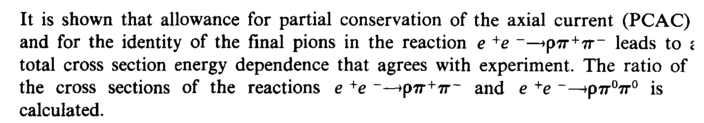 It is shown that allowance for partial conservation of the axial current (PCAC) and for the identity of the final pions in the reaction e +e ~—φπ+7τ~ leads to ι total cross section energy dependence that agrees with experiment. The ratio of the cross sections of the reactions e +e ~—>Ò7Ç+ÔÇ~ and e +e ~—>Ò7ǰ7ǰ is calculated.