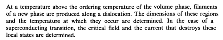 At a temperature above the ordering temperature of the volume phase, filaments of a new phase are produced along a dislocation. The dimensions of these regions and the temperature at which they occur are determined. In the case of a superconducting transition, the critical field and the current that destroys these local states are determined.
