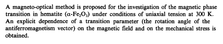 A magneto-optical method is proposed for the investigation of the magnetic phase transition in hematite (a-Fe203) under conditions of uniaxial tension at 300 K. An explicit dependence of a transition parameter (the rotation angle of the antiferromagnetism vector) on the magnetic field and on the mechanical stress is obtained.