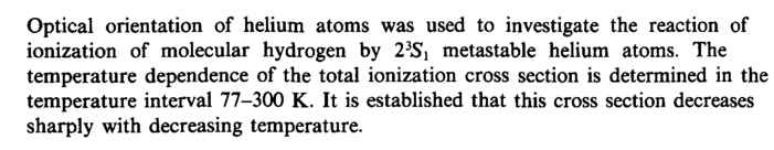 Optical orientation of helium atoms was used to investigate the reaction of ionization of molecular hydrogen by 23Si metastable helium atoms. The temperature dependence of the total ionization cross section is determined in the temperature interval 77-300 K. It is established that this cross section decreases sharply with decreasing temperature.
