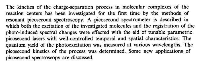 The kinetics of the charge-separation process in molecular complexes of the reaction centers has been investigated for the first time by the methods of resonant picosecond spectroscopy. A picosecond spectrometer is described in which both the excitation of the investigated molecules and the registration of the photo-induced spectral changes were effected with the aid of tunable parametric picosecond lasers with well-controlled temporal and spatial characteristics. The quantum yield of the photoexcitation was measured at various wavelengths. The picosecond kinetics of the process was determined. Some new applications of picosecond spectroscopy are discussed.