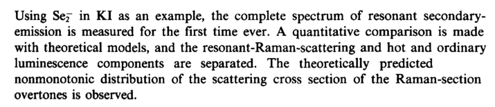 Using Sef in KI as an example, the complete spectrum of resonant secondary-emission is measured for the first time ever. A quantitative comparison is made with theoretical models, and the resonant-Raman-scattering and hot and ordinary luminescence components are separated. The theoretically predicted nonmonotonic distribution of the scattering cross section of the Raman-section overtones is observed.