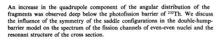 An increase in the quadrupole component of the angular distribution of the fragments was observed deep below the photofission barrier of 232Th. We discuss the influence of the symmetry of the saddle configurations in the double-hump-barrier model on the spectrum of the fission channels of even-even nuclei and the resonant structure of the cross section.