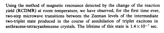 Using the method of magnetic resonance detected by the change of the reaction yield (RCDMR) at room temperature, we have observed, for the first time ever, two-step microwave transitions between the Zeeman levels of the intermediate two-triplet state produced in the course of annihilation of triplet excitons in anthracene-tetracyanbenzene crystals. The lifetime of this state is 1.4X 10~7 sec.