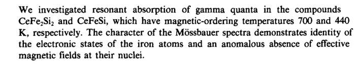 We investigated resonant absorption of gamma quanta in the compounds CeFe2Si2 and CeFeSi, which have magnetic-ordering temperatures 700 and 440 K, respectively. The character of the Mossbauer spectra demonstrates identity of the electronic states of the iron atoms and an anomalous absence of effective magnetic fields at their nuclei.