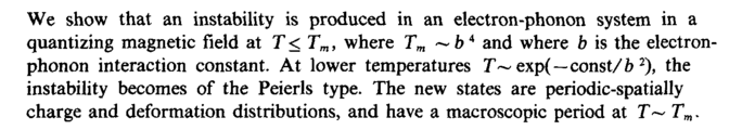 We show that an instability is produced in an electron-phonon system in a quantizing magnetic field at T<Tm, where Tm ~ b4 and where b is the electron-phonon interaction constant. At lower temperatures Г~ exp(—const/ b 2), the instability becomes of the Peierls type. The new states are periodic-spatially charge and deformation distributions, and have a macroscopic period at Г~ Tm.