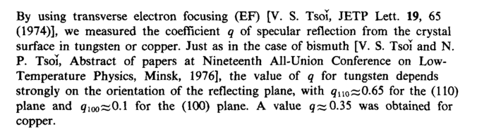 By using transverse electron focusing (EF) [V. S. Tsoi, JETP Lett. 19, 65 (1974)], we measured the coefficient q of specular reflection from the crystal surface in tungsten or copper. Just as in the case of bismuth [V. S. Tsoi and N. P. Tsoi, Abstract of papers at Nineteenth All-Union Conference on Low-Temperature Physics, Minsk, 1976], the value of q for tungsten depends strongly on the orientation of the reflecting plane, with qnQ~0.65 for the (110) plane and g100~0.1 for the (100) plane. A value g^0.35 was obtained for copper.
