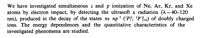We have investigated simultaneous s and ρ ionization of Ne, Ar, Kr, and Xe atoms by electron impact, by detecting the ultrasoft χ radiation (λ — 40-120 nm), produced in the decay of the states ns np 5 (Ψ?9 ЪР ?ш) of doubly charged ions. The energy dependences and the quantitative characteristics of the investigated phenomena are studied.