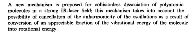 A new mechanism is proposed for collisionless dissociation of polyatomic molecules in a strong IR-laser field; this mechanism takes into account the possibility of cancellation of the anharmonicity of the oscillations as a result of conversion of an appreciable fraction of the vibrational energy of the molecule into rotational energy.