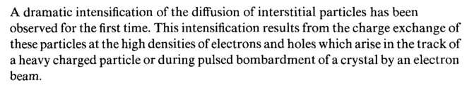 A dramatic intensification of the diffusion of interstitial particles has been observed for the first time. This intensification results from the charge exchange of these particles at the high densities of electrons and holes which arise in the track of a heavy charged particle or during pulsed bombardment of a crystal by an electron beam.