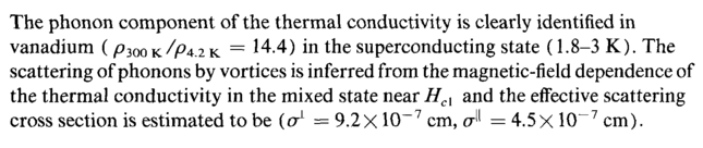 The phonon component of the thermal conductivity is clearly identified in vanadium ( Рзоо^/р^2 к = 14.4) in the superconducting state (1.8-3 K). The scattering of phonons by vortices is inferred from the magnetic-field dependence of the thermal conductivity in the mixed state near HcX and the effective scattering cross section is estimated to be (о1 = 9.2X 10~7 cm, σ11 = 4.5X 10^7 cm).